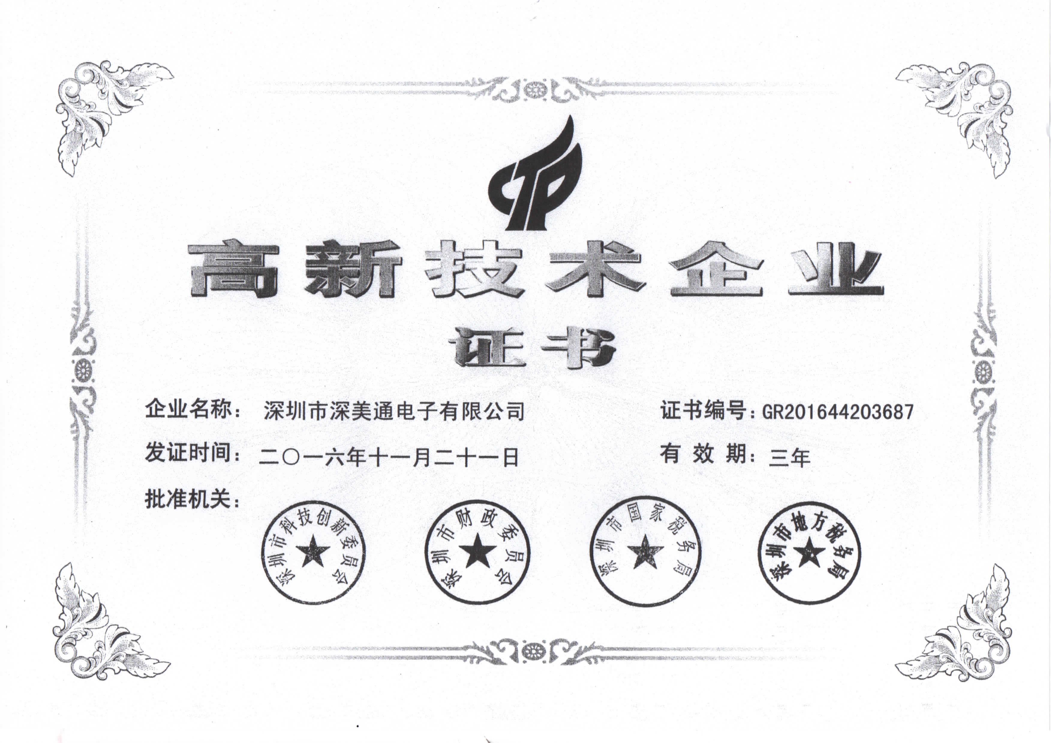 2017新年的钟声即将敲响,在这辞旧迎新之际,深圳市深美通电子有限公司也喜迎佳音——根据国家《高新技术企业认定管理办法》和《高新技术企业认定管理工作指引》的相关规定,深圳市深美通电子有限公司被认定为国家级高新技术企业。近日,公司也已收到了由深圳市科技创新委员会、深圳市财政委员会、深圳市国家税务局、深圳市地方税务局联合颁发的“国家高新技术企业”认定证书,由此正式迈入国家高新技术企业行列。